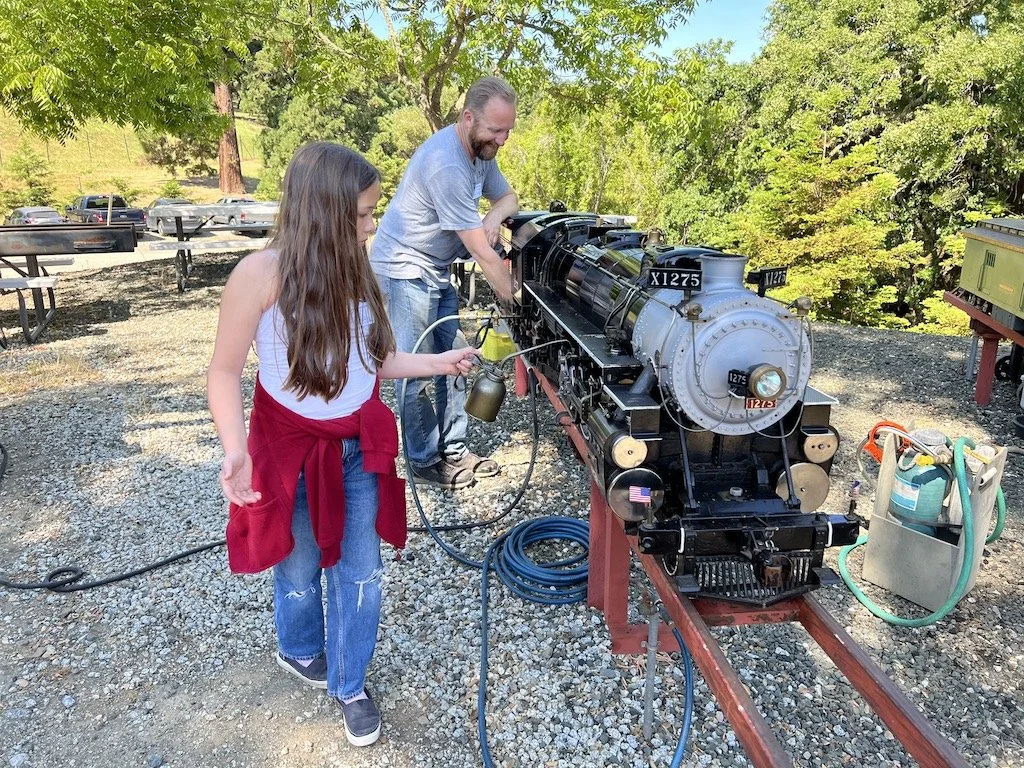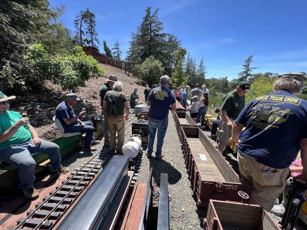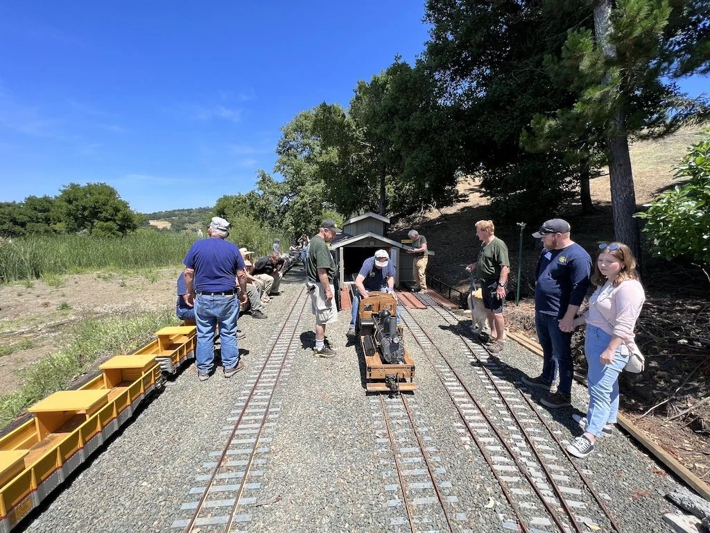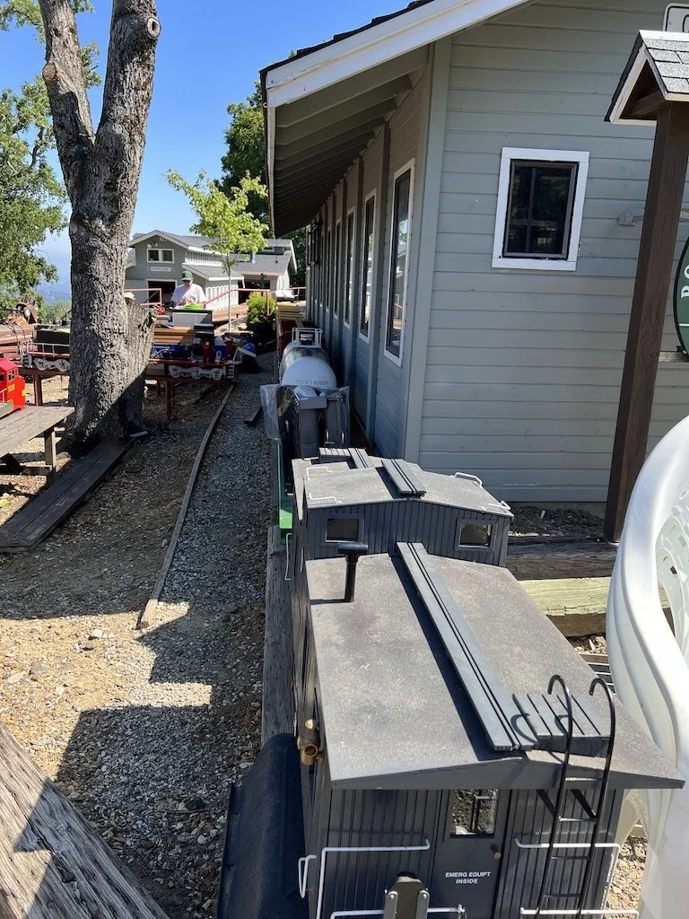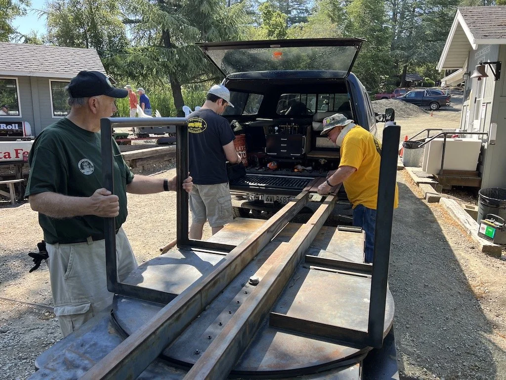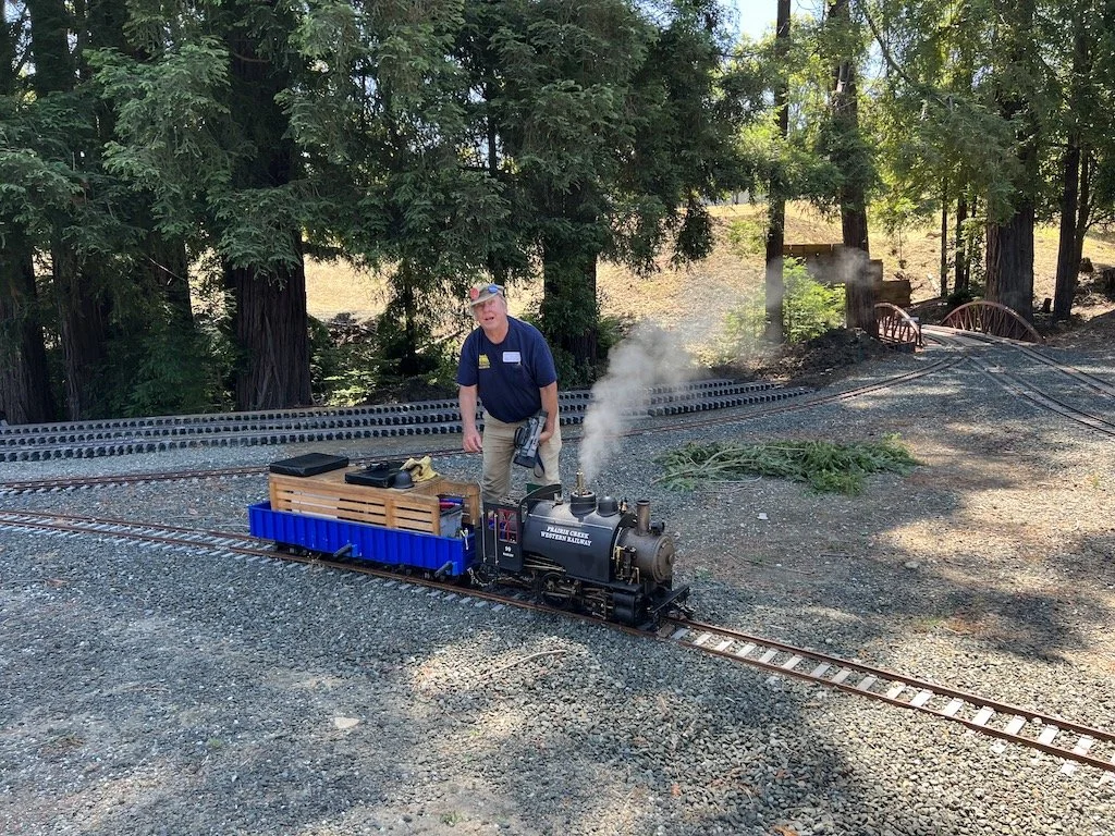 The new Santa Fe engine “Big Red” was taken on it’s maiden trips around the right of way. Two of the cars have flat-spotted wheels that need to be replaced. The engine seems to want to go fast and may not be a good work engine. Until the air brakes install is completed no more than two passenger cars should be used with this engine as it wants to run downhill.