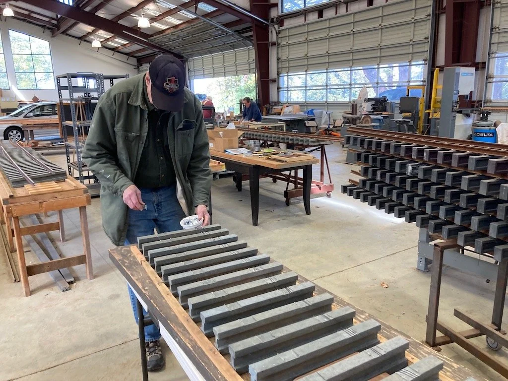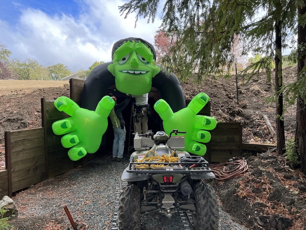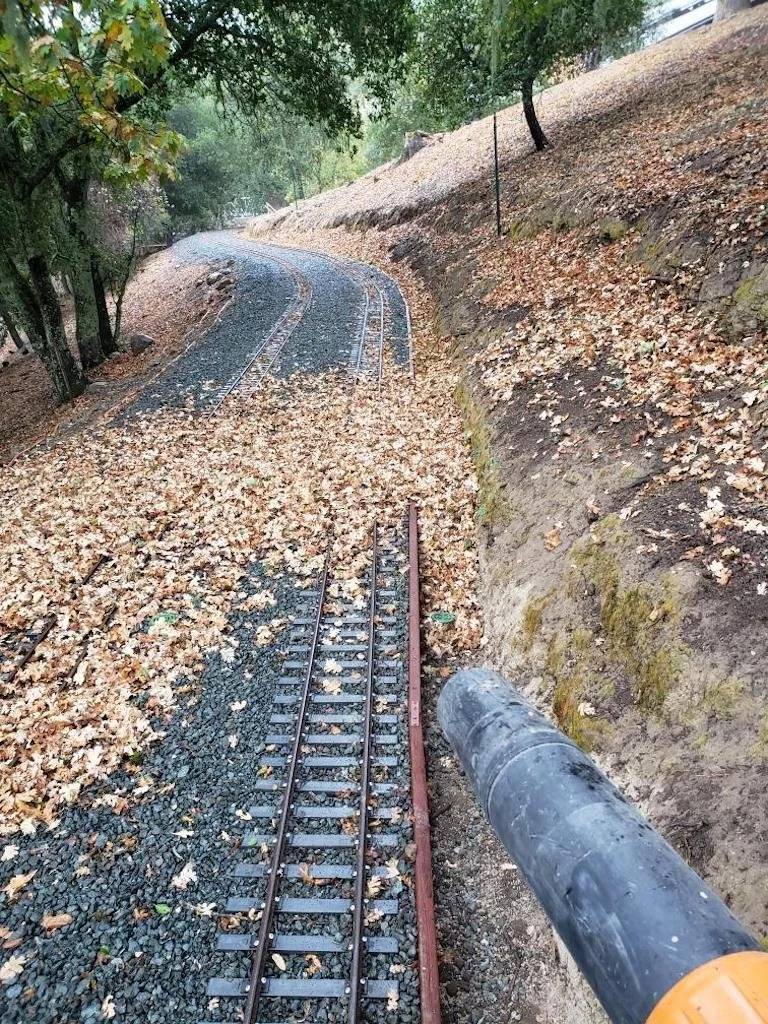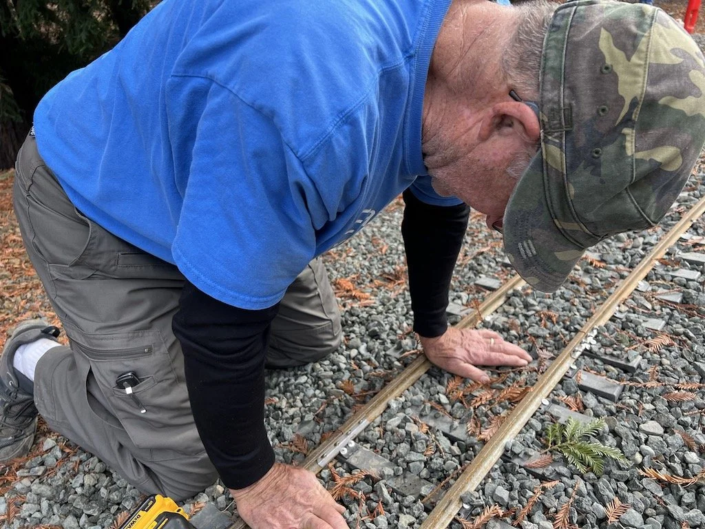 Bruce follows Kevin to sweep the leaves off in prep for the big meet