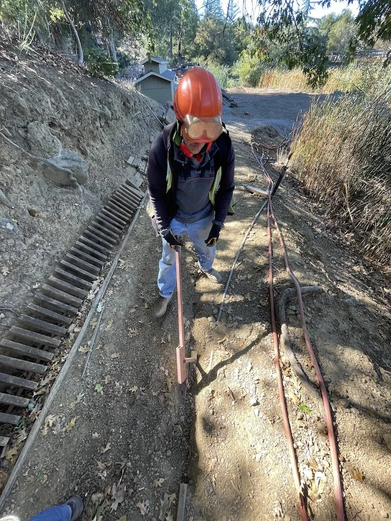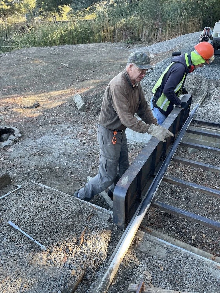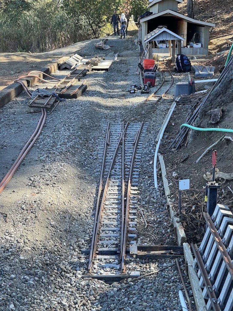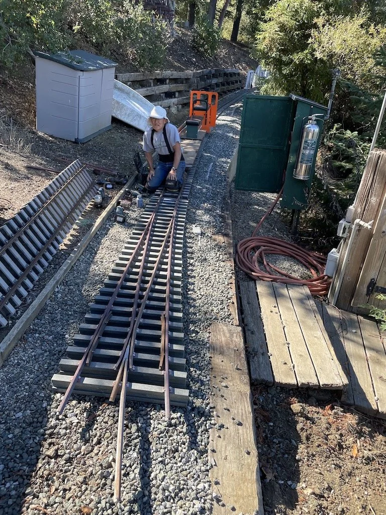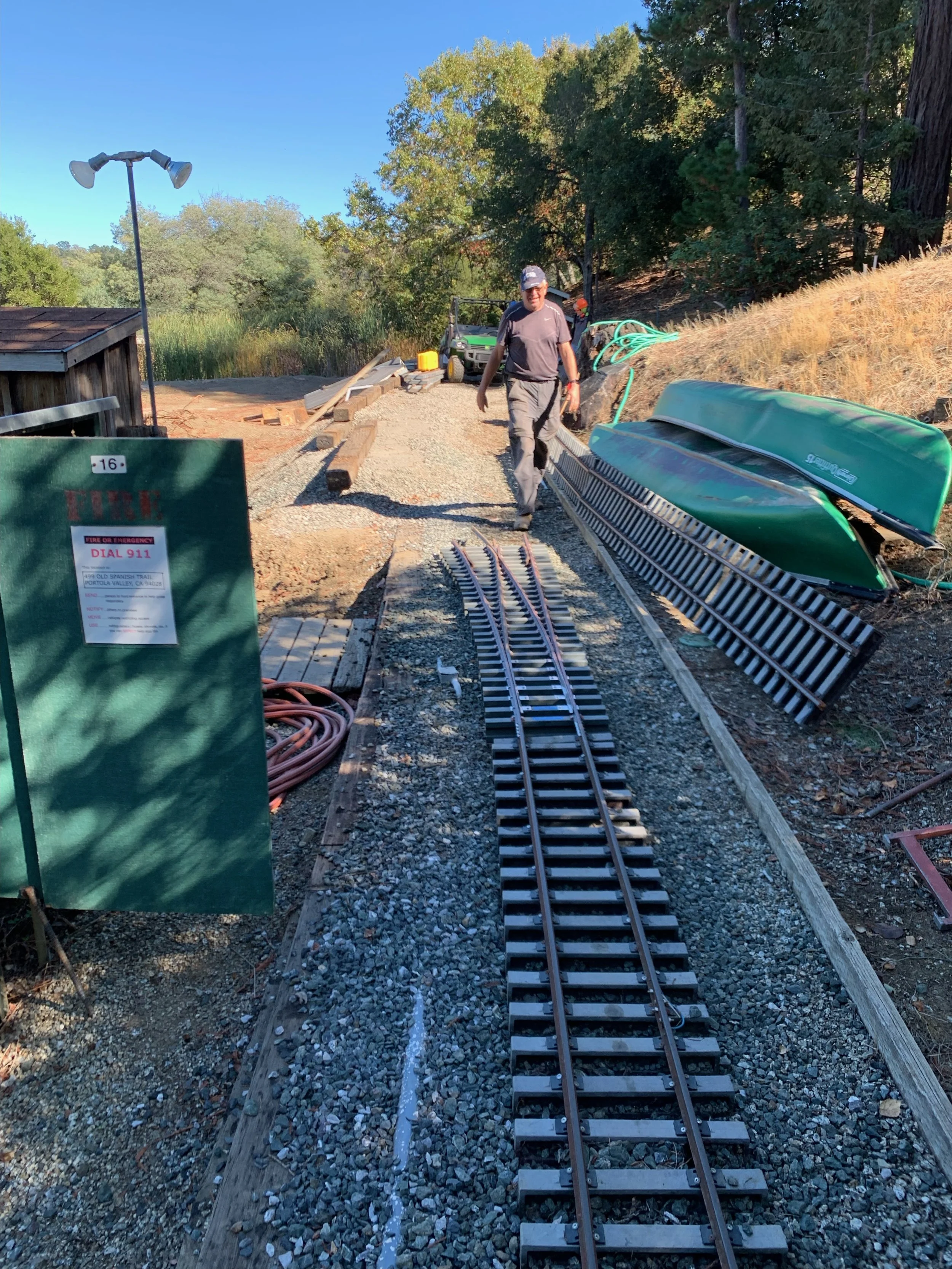 There was a flurry of activity in the Lakeside Siding area all day. The old bridge was removed and carted up to the shop. The track from the dock to Crana’s Corner was removed. Immediately Kevin started to install the new switches needed to convert the siding into the mainline for as long as needed.
