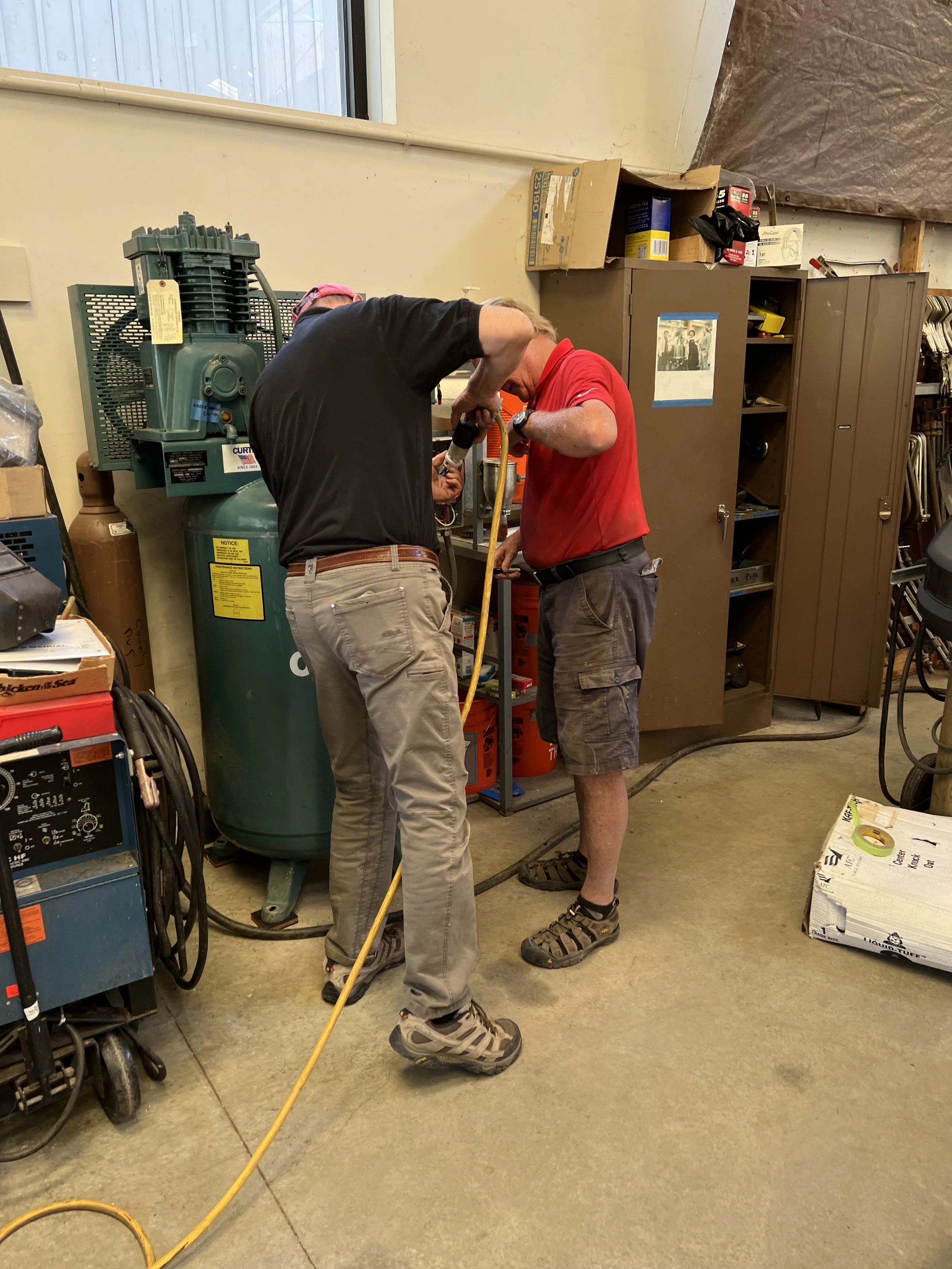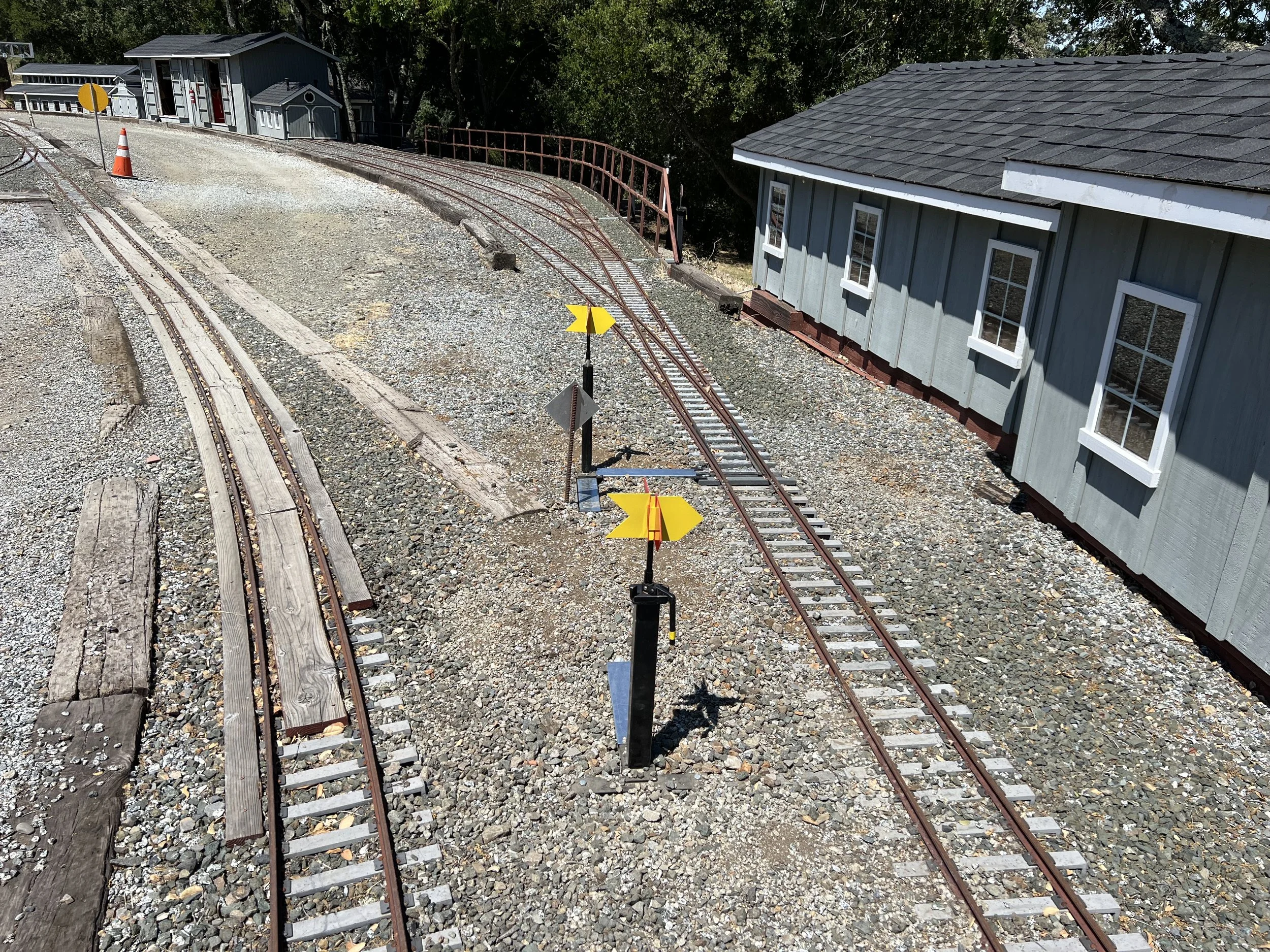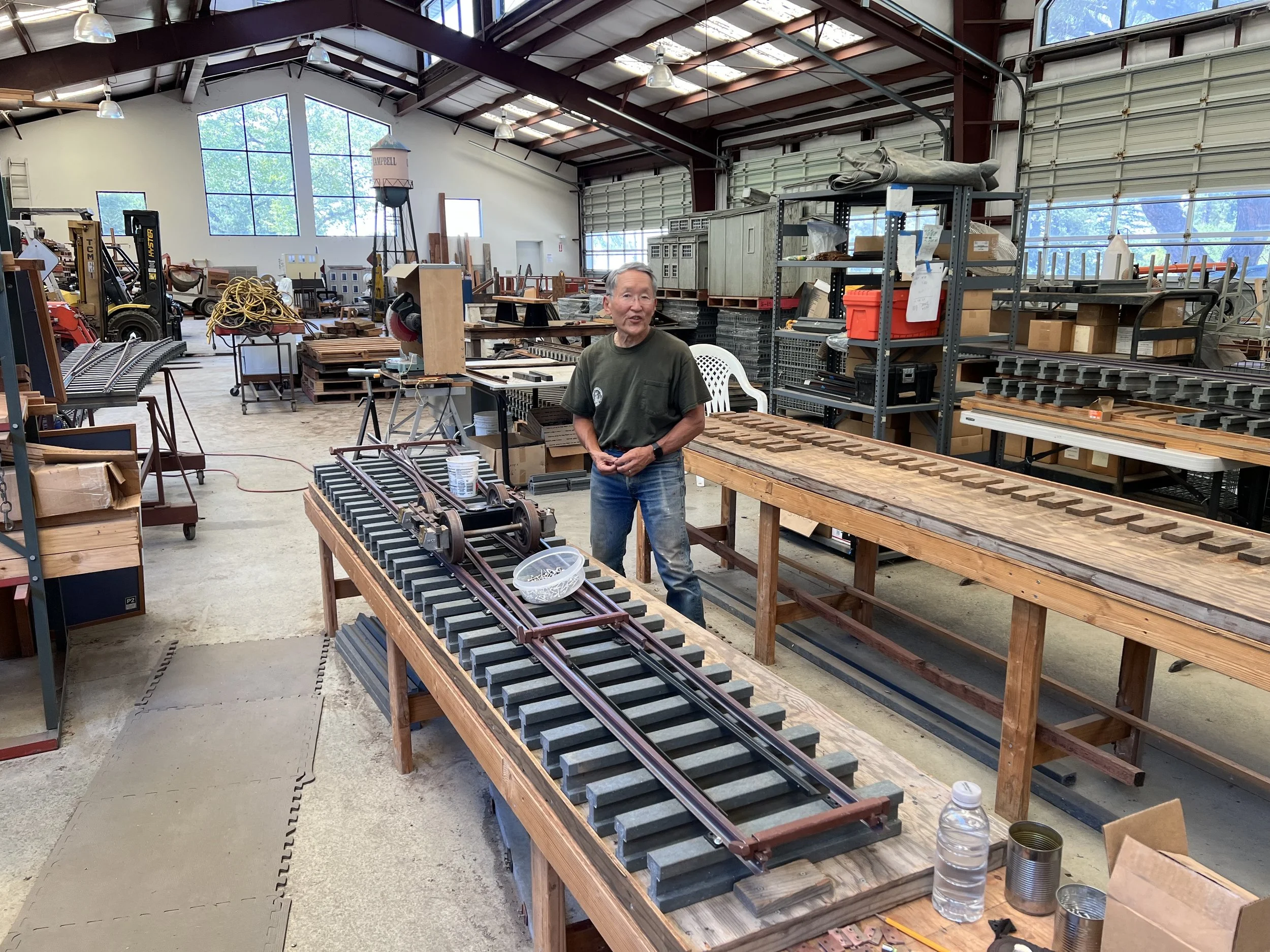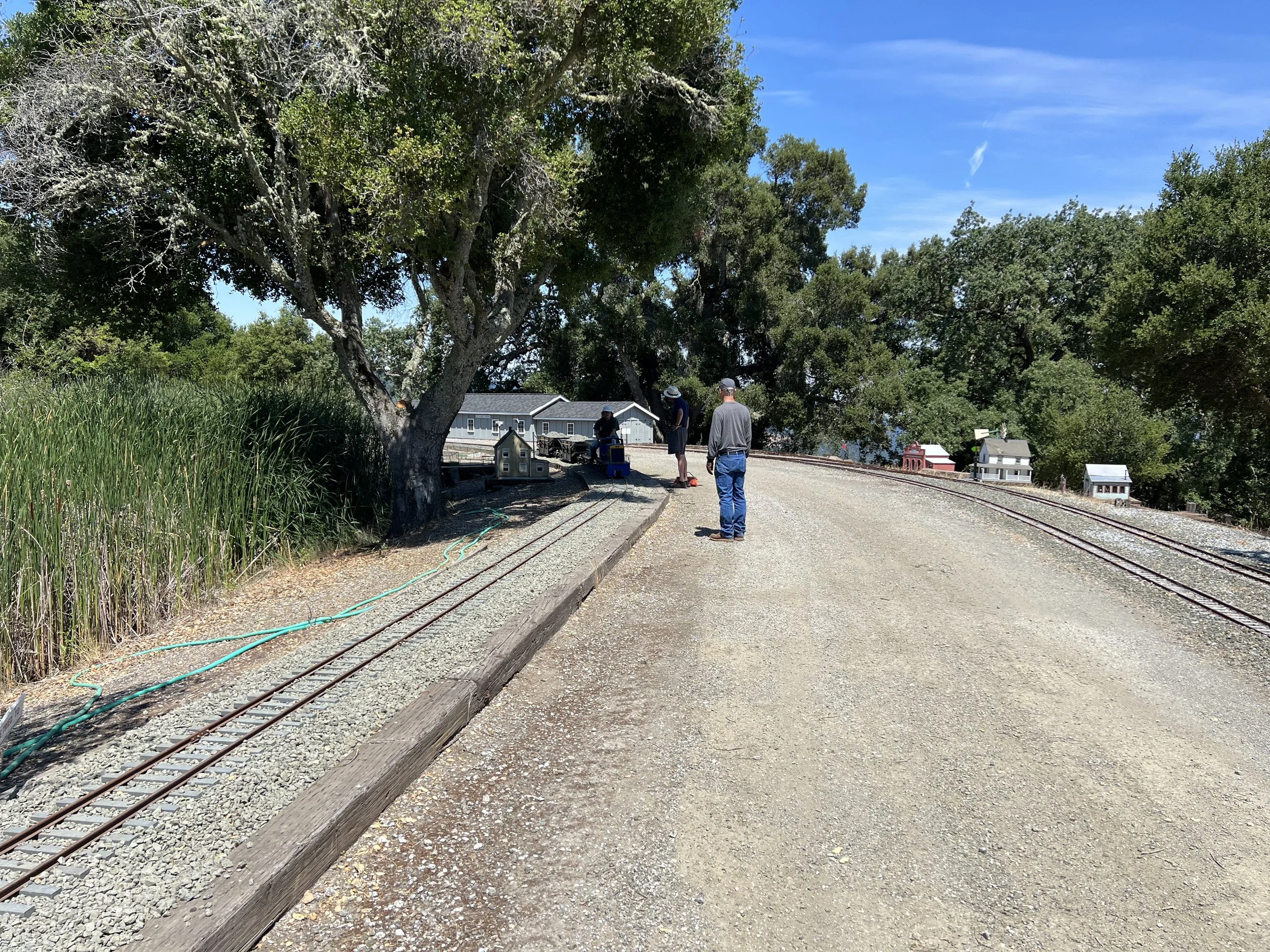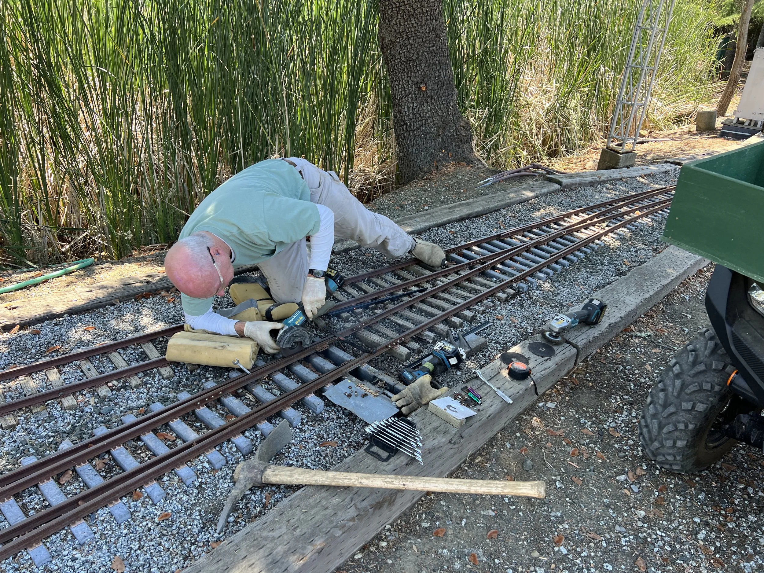 Lots of folks worked on prepping for the June run. Switches were inspected and two needed emergency repairs. Kevin, Russ, & Bruno ballasted the track that was installed in May. Bill installed indicators on a newly installed remote switch. Tom and Carl repaired the sticky door to engine house one.